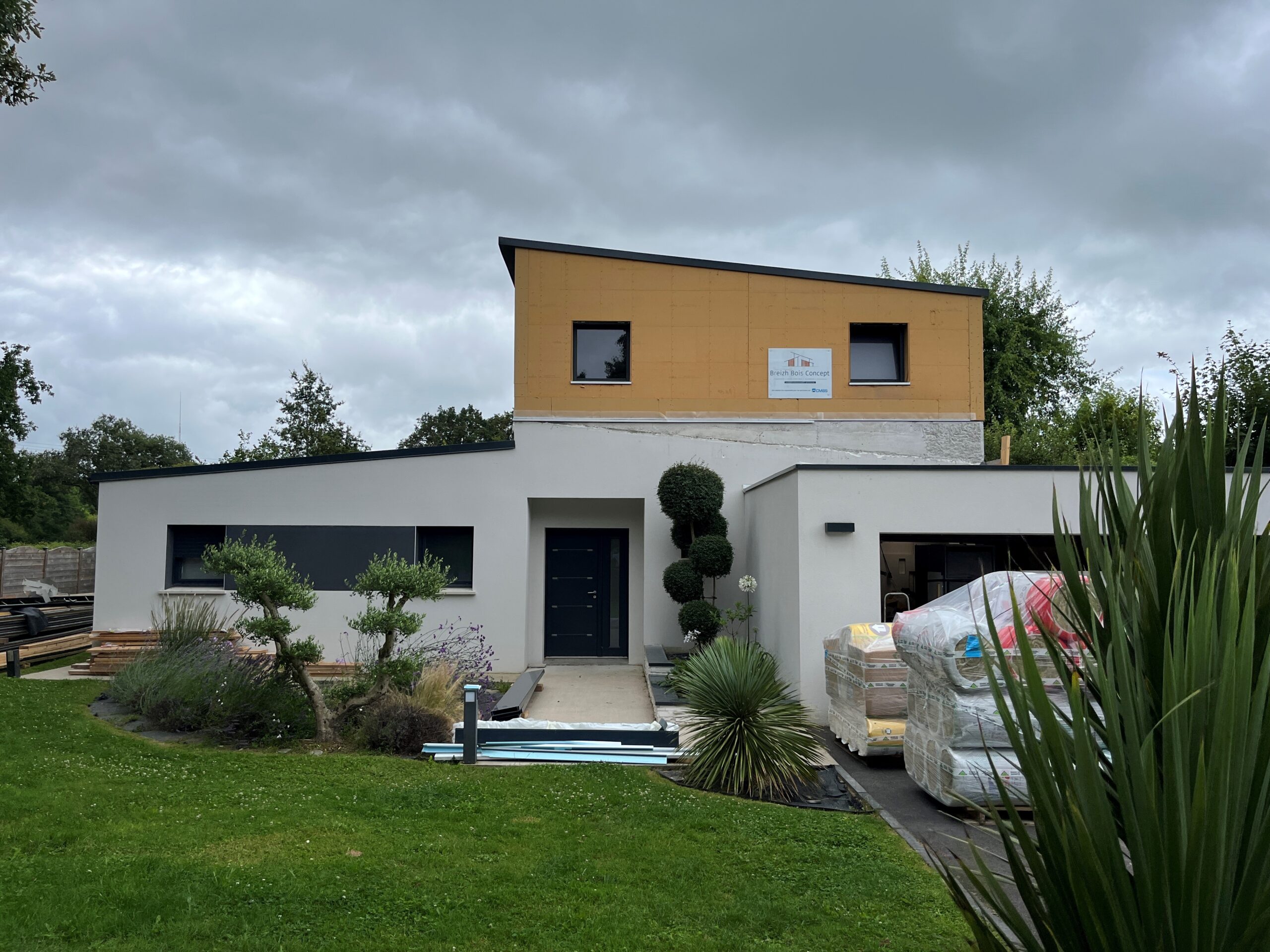 Nos équipes de charpentiers, menuisiers et couvreurs s’attèlent à réaliser la surélévation et l’extension de cette maison située sur la commune de Savenay (44260). Réalisée en ossature bois, cette surélévation sera ensuite enduite, ainsi la finition sera identique au reste de la maison existante.